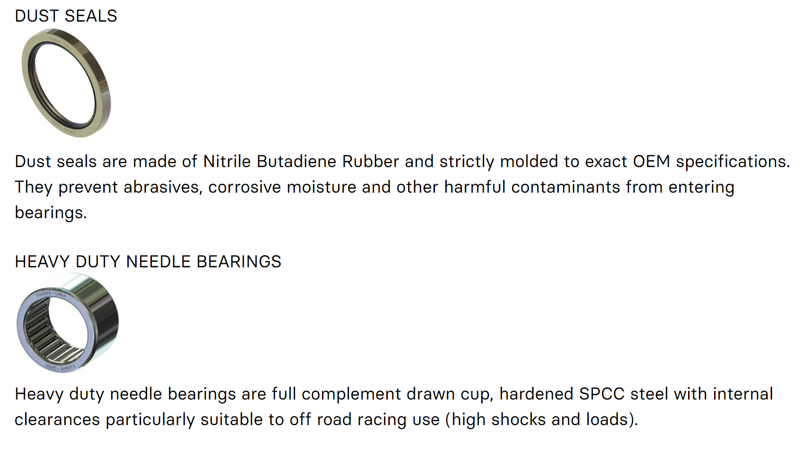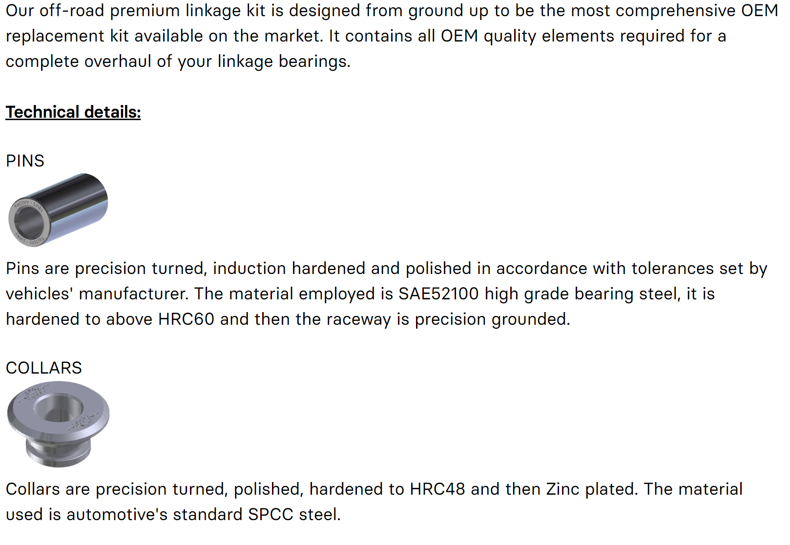 Our premium kits contain all elements required for a full OEM quality service of your linkage. Our dedicated off-road design of needle bearings, collars, pins and dust seals are specifically manufactured in order to reach the stringent OEM quality requirements, in terms of materials, dimension tolerances, hardness and finish.